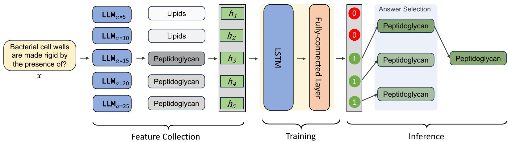 3.推理阶段:对新输入的问题,生成多强度响应后,用训练好的LSTM分类器评估各响应的准确性。若存在准确响应,选择置信度最高的输出;若所有响应均不准确,则输出“我没有评论”以表达不确定性。