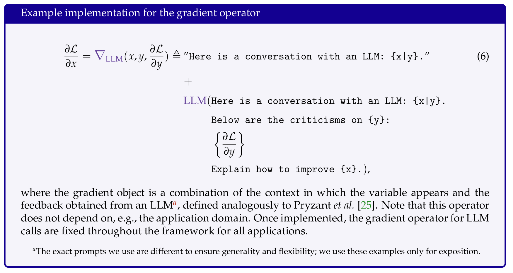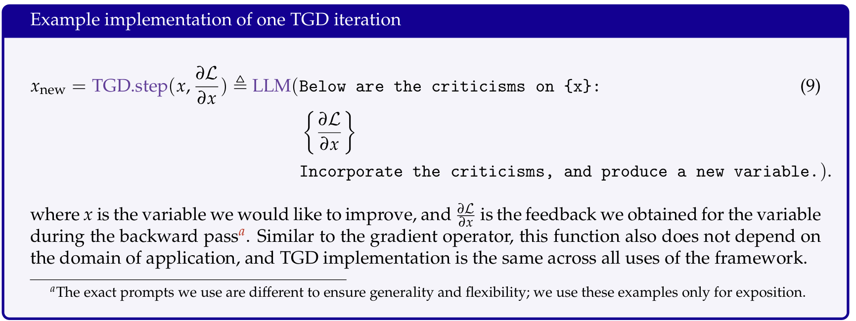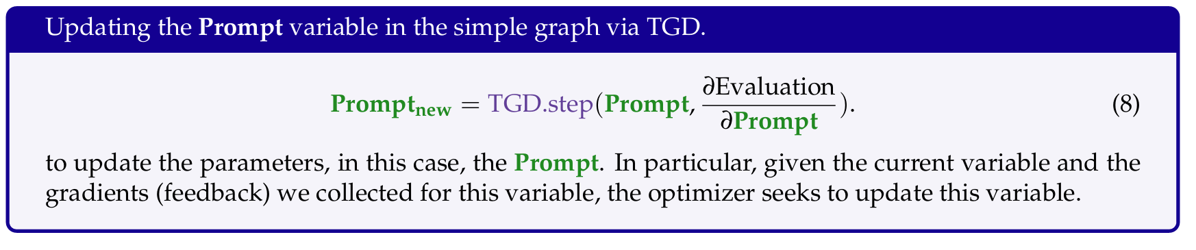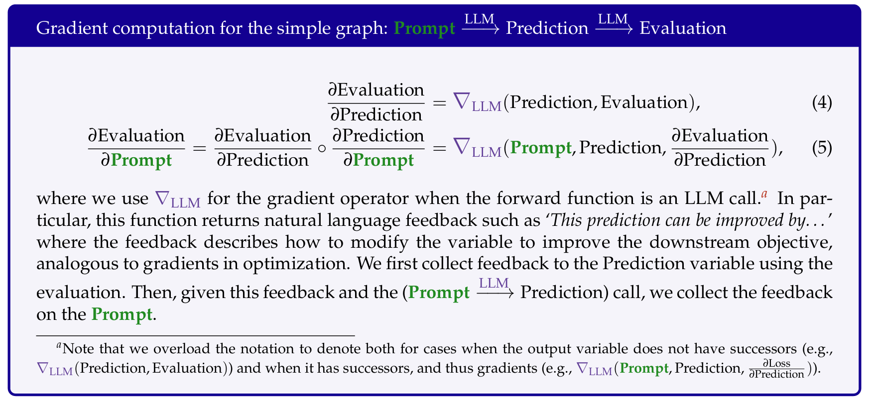 注意,这里的原来的AI系统是Prompt->Prediction,后面的Evaluation是计算梯度额外增加的。这里先计算了Prediction的梯度,即直接将Evaluation Instruction和Prediction给LLM,然后得出Evaluation,然后再计算Prompt梯度。