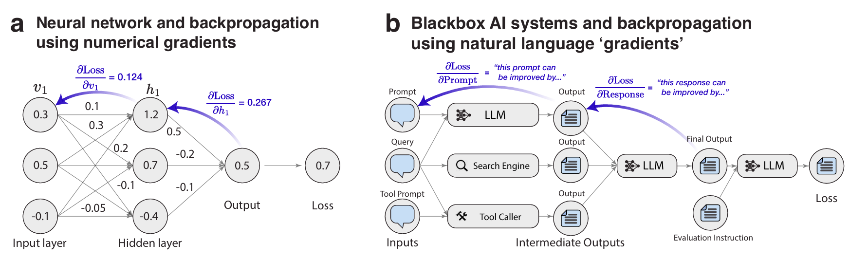 这里的a图就是神经网络,b图就是一个大的AI系统。textgrad借鉴了神经网络中的通过反向传播更新权重的方法,同样也是要计算损失,梯度等,但是这里所有的损失和梯度都是由文字表示的。