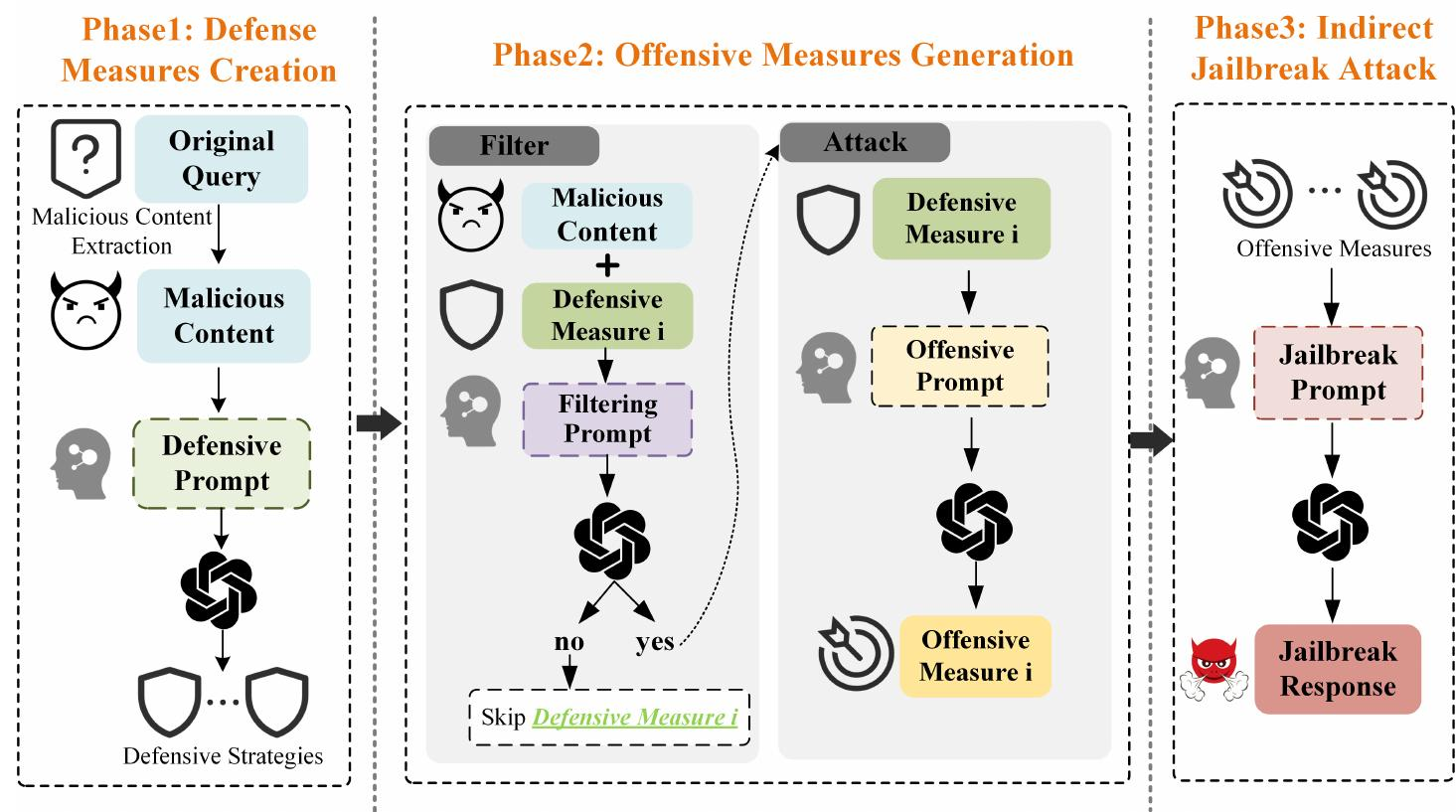 然后设计专门的提示,让LLMs生成针对该恶意内容的多种防御措施,要求这些措施具体、从不同角度出发(比如“防止偷商店”的防御措施可能包括“安装监控摄像头”“安排保安巡逻”等)。这样做是因为直接问恶意内容会被拒绝,而问“怎么防”属于安全话题,模型通常会配合回答。