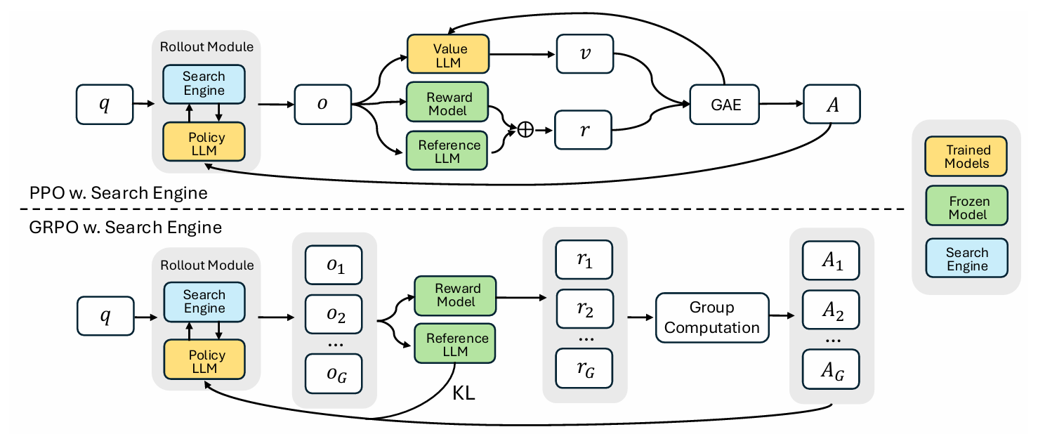 文章使用两种方式(PPO和GRPO)对训练模型进行优化,具体过程图如下: