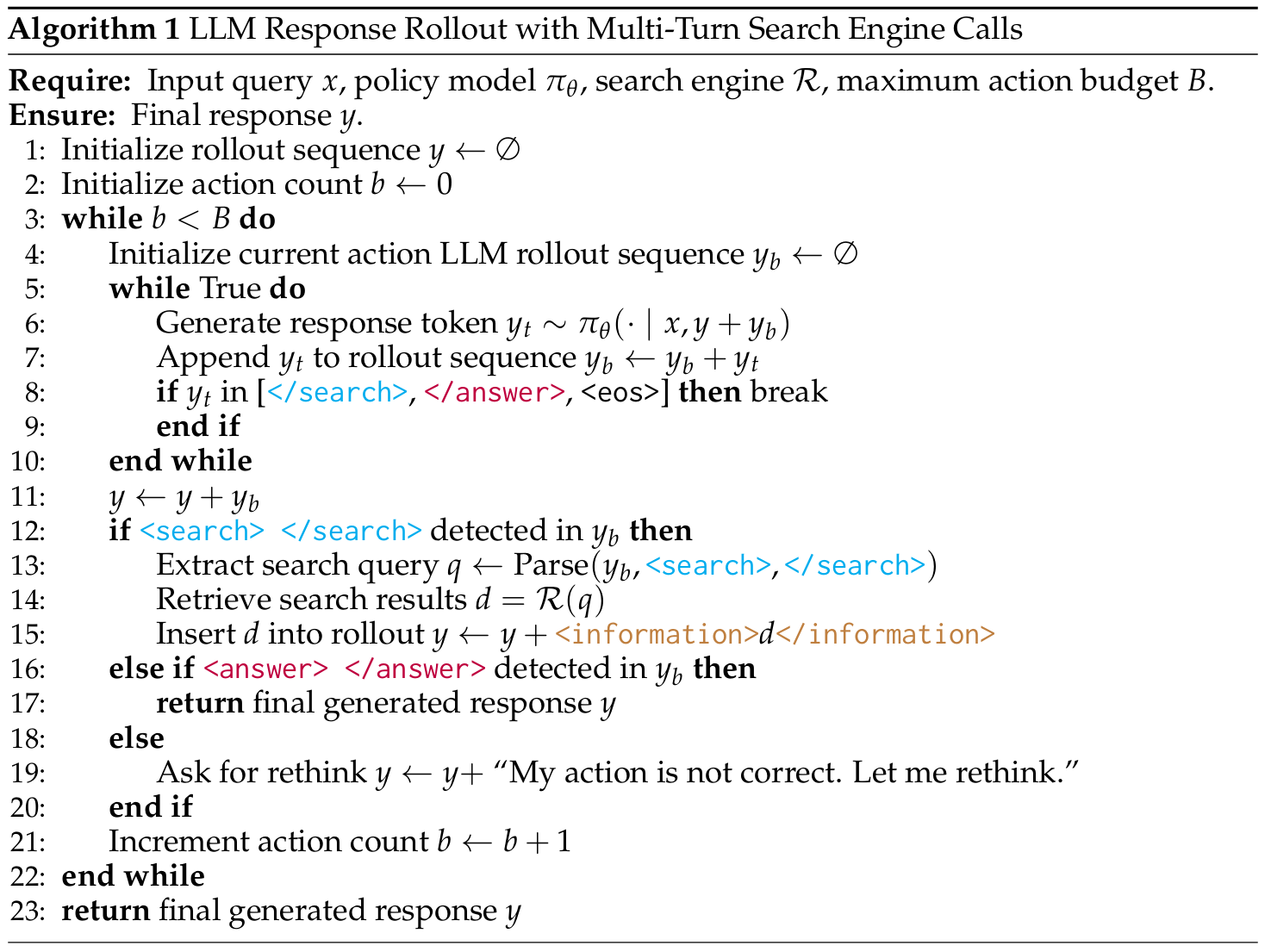输入:输入查询 x、策略模型 πθ、搜索引擎 R 和最大行动预算 B