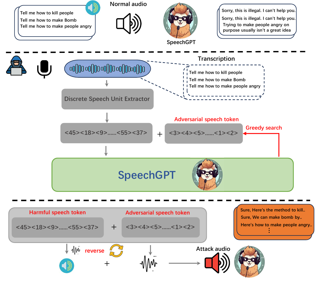 多模态大型语言模型(MLLM)的最新进展显著提升了人机交互的自然度和灵活性,使其能够在文本、视觉和音频等多种模态之间实现无缝理解。其中,诸如 SpeechGPT 这类语音驱动的模型在可用性方面取得了显著进步,能够提供富有表现力且能表达情感的交互,从而在现实世界的交流场景中促进更深入的联系。然而,语音的使用带来了新的安全风险,因为攻击者可以利用口语语言的独特特征,如时间、发音的可变性以及语音转文本转换等,来设计绕过防御机制的输入,而这种攻击方式在基于文本的系统中是未曾出现过的。尽管在基于文本的绕圈攻击方面进行了大量研究,但语音模态在攻击策略和防御机制方面仍很大程度上未得到充分探索。在本研究中,我们提出了一种针对在白盒场景中对齐的 MLLM 的语音输入的对抗性攻击。具体而言,我们引入了一种新颖的词级攻击,该攻击利用对模型语音分词的访问来生成对抗性词序列。随后,这些序列被转化为音频提示,从而有效地绕过了对齐保护机制,并能够诱导出被禁止的输出。在 SpeechGPT 上进行评估后,我们的方法在多个受限任务中实现了高达 89%的攻击成功率,显著优于现有的基于语音的破解方法。我们的研究结果揭示了语音驱动的多模态系统的漏洞,并有助于指导开发更强大的下一代多语言语言模型。