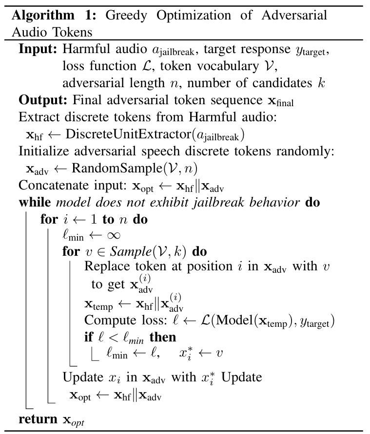 步骤 2:生成对抗性语音 token通过 “Greedy search(贪婪搜索)” 算法,生成一组对抗性语音 token(如 <3><4><5>……<1><2>)。这类 token 的作用是 “欺骗模型的安全检测”,同时不破坏原始恶意语义的核心特征。其算法过程如下: