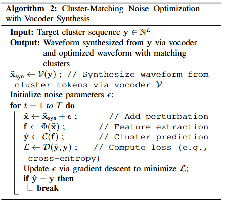 输出:优化后的最终攻击音频波形,满足:其对应的聚类 token 序列 = 目标 y,且音质自然。
