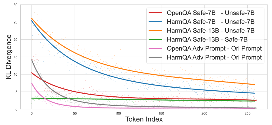 上图是KL散度,文章用其表示同一个输入下,不同模型对下一个 token 的预测分布差距,可以看到前期安全和不安全模型间差距大,但后面逐渐变小。