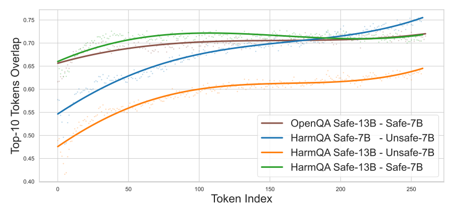上图是安全和不安全模型对于同一个问题的前十个候选token的重叠度,可以看到前期重叠度低,后期逐渐增加。