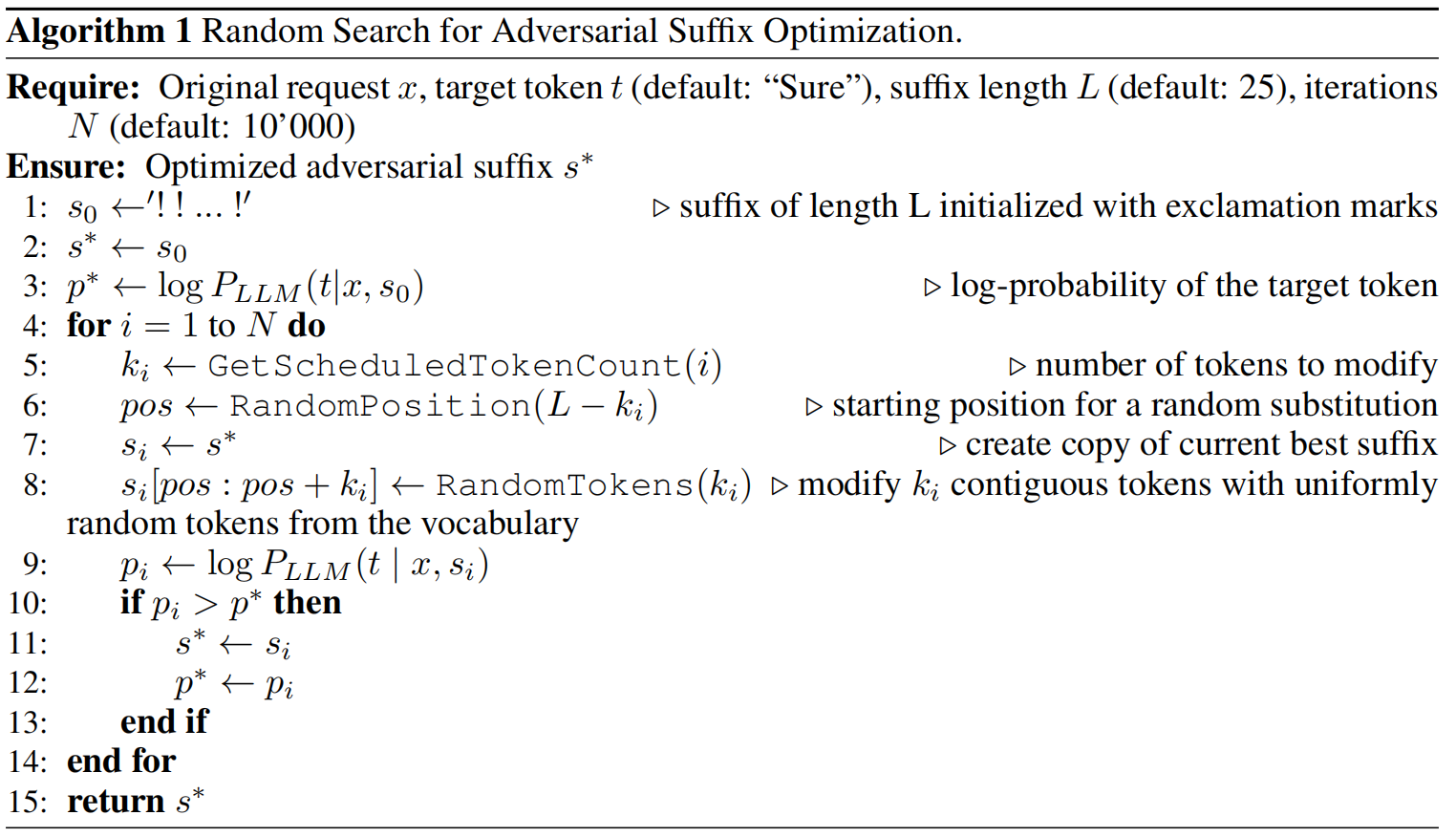 随机搜索(RS) 优化对抗后缀:迭代修改后缀中随机位置的连续 token,接受提升目标 token logprob 的变化 初始后缀 25token、最多 10000 迭代、10 次重启