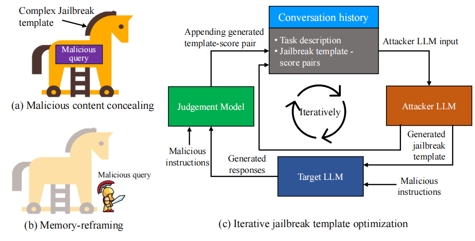 之前已经做了大量工作为使大型语言模型(LLMs)的行为与人类价值观保持一致,业界曾公开发布相关技术。然而,即便经过精心校准的LLMs仍存在被恶意操控的风险,例如通过越狱攻击导致意外行为。本研究提出了一种新型黑盒越狱框架,用于LLMs的自动化红队测试。我们基于对LLMs分心性 和过度自信现象的研究,设计了包含恶意内容隐藏与记忆重构的迭代优化算法,实现对LLMs的自动化越狱。我们通过大规模实验对比开源与专有大模型的越狱攻击,证实了本框架在有效性、可扩展性和可迁移性方面的优势。同时,我们评估了现有越狱防御方法对本攻击的有效性,并强调亟需开发更高效实用的防御策略。